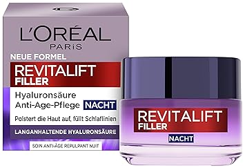 Anti-ageing night cream with micro filler hyaluronic acid: plumping care for the skin from 30 years to fill wrinkles and sleep lines during the night regeneration phase, suitable for all skin types Result: hydrated and fresh skin after waking up, 48h moisturisation, plumper complexion and visibly restored facial volume Directions for use: daily in the evening after facial cleansing, apply cream to face, neck and décolleté with circular upward movements IMPROVED FORMULA Enriched with Galanga extract (Thai Ginger), Micro Hyaluronic Acid to cushion the upper layers of the skin and Micro Filler Hyaluronic Acid for a replenishing action against wrinkles Box contents: 1x L'Oréal Paris Revitalift Filler [Hyaluronic Acid] Anti-Age Night Cream, 50 ml Product Description With age, the skin looks tired, wrinkled and is bagged in itself, because in the ageing process, the natural hyaluronic acid content of the skin decreases steadily. The skin sags and loses its elasticity. L'Oréal Paris Revitalift Filler [+ Hyaluronic Acid] Plumping Anti-Age Night Cream counteracts the signs of ageing with 3 types of pure hyaluronic acid and helps fill sleep lines and refresh the skin overnight. The anti-ageing moisturising cream is suitable for all skin types: the product compatibility is tested on all skin types (dry, sensitive and combination skin). Especially suitable for the skin from approx. 30 years. For over 30 years, L'Oréal Paris has been involved with alternative test methods for cosmetic products for a world without animal testing. Directions A